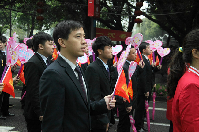 当天,天气略冷,还下起了绵绵的春雨,壹加壹人却仍然展现出了抖擞的精神面貌。在壹加壹的队列方阵中,女士身穿壹加壹标志性的竖纹红色工裙,男士则以行政人员的浅蓝色西装上阵,手执爱心牌子和慈善万人行的旗子。队伍整齐地走过兴中道时,成为了一道亮丽的风景线,不时有市民认出并拿起手机拍照,冷冷的雨天也顿添数分热闹。壹加壹人心怀大爱,一路面带温暖笑容,不时主动向市民问好。已经多次参加壹加壹万人行巡游队伍的阿林就说:“虽然今天下雨了,但是参加这个活动我还是觉得很开心。一方面,这是做善事嘛,另一方面,万人行算是中山的一个重要的文化符号,很多外国人都有参与其中,我能够参加觉得很自豪。”