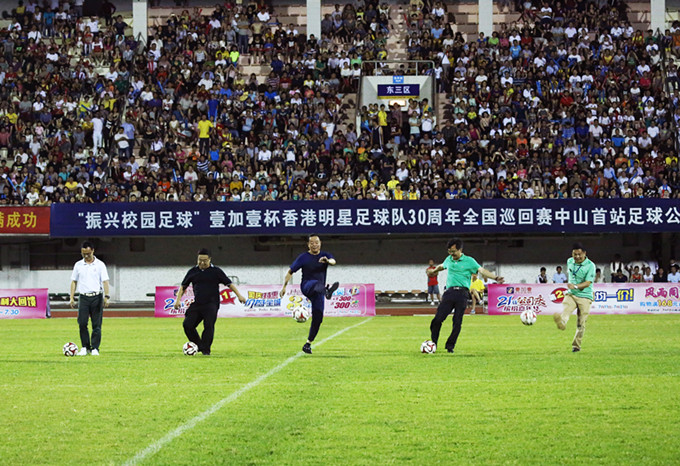 盛夏六月,激扬青春。为振兴中山校园足球,促进青少年健康成长,6月27日晚上,由中山市教育和体育局、中山日报社、广东壹加壹商业连锁有限公司联合主办,中山千羽文化传播有限公司策划承办的大型文体公益赛事——“壹加壹杯”香港明星足球队30周年全国巡回赛首站中山公益赛于兴中体育广场活力开赛。中山市教育和体育局、中山日报社、广东壹加壹商业连锁有限公司等有关单位领导代表以及三支参赛球队队员共同出席本次公益球赛,与来自五湖四海的球迷观众相聚于兴中体育场绿茵草地。